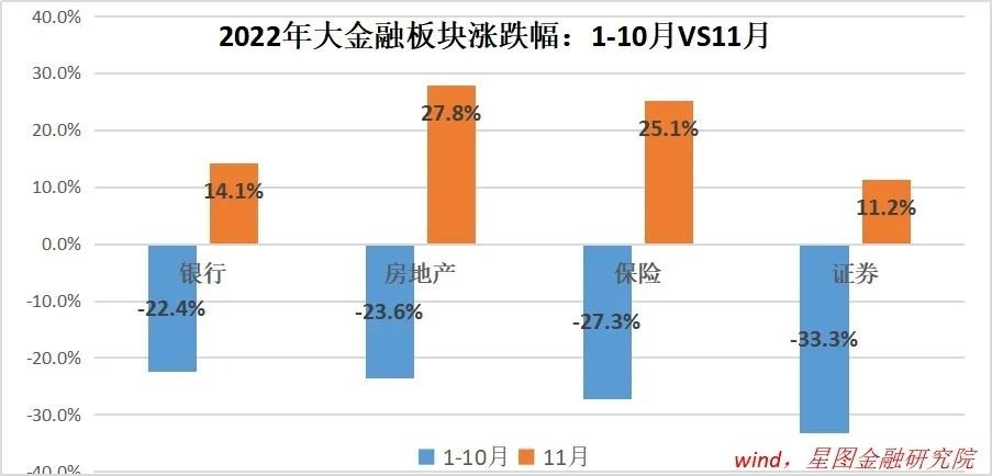 大金融板块主要包括银行、券商、保险和地产,各有各的行情逻辑,就2022年行情来看,以11月为界,可以分为两段。1-10月份,行情表现均不理想,申万银行、地产、保险、券商指数分别下跌22.4%、23.6%、27.3%和33.3%;11月当月,以地产“三支箭”齐发为契机,大金融板块快速反弹,申万银行、地产、保险、券商指数分别上涨14.1%、27.8%、25.1%和11.2%。