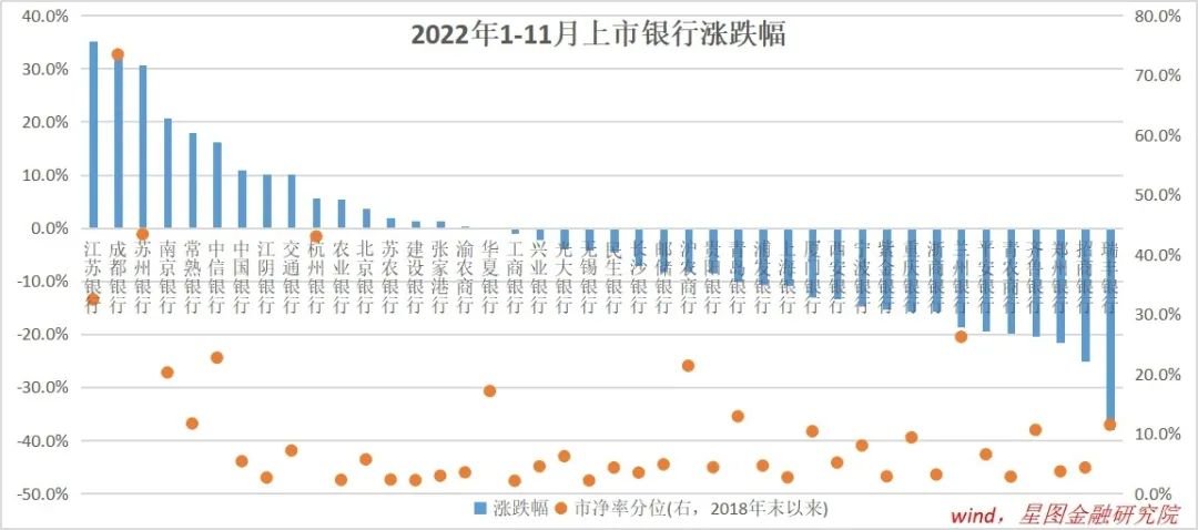 就2022年的行情来看,银行个股走势差异很大,有些银行估值已处于相对高位,无差别买入并非好的策略。在个股选择层面,可以从超跌反弹的估值修复和长期竞争力提升两个度精选个股,在这个意义上,优质股份制银行前期跌幅较大、中长期发展前景向好,在这波行情中有望录得更大涨幅。