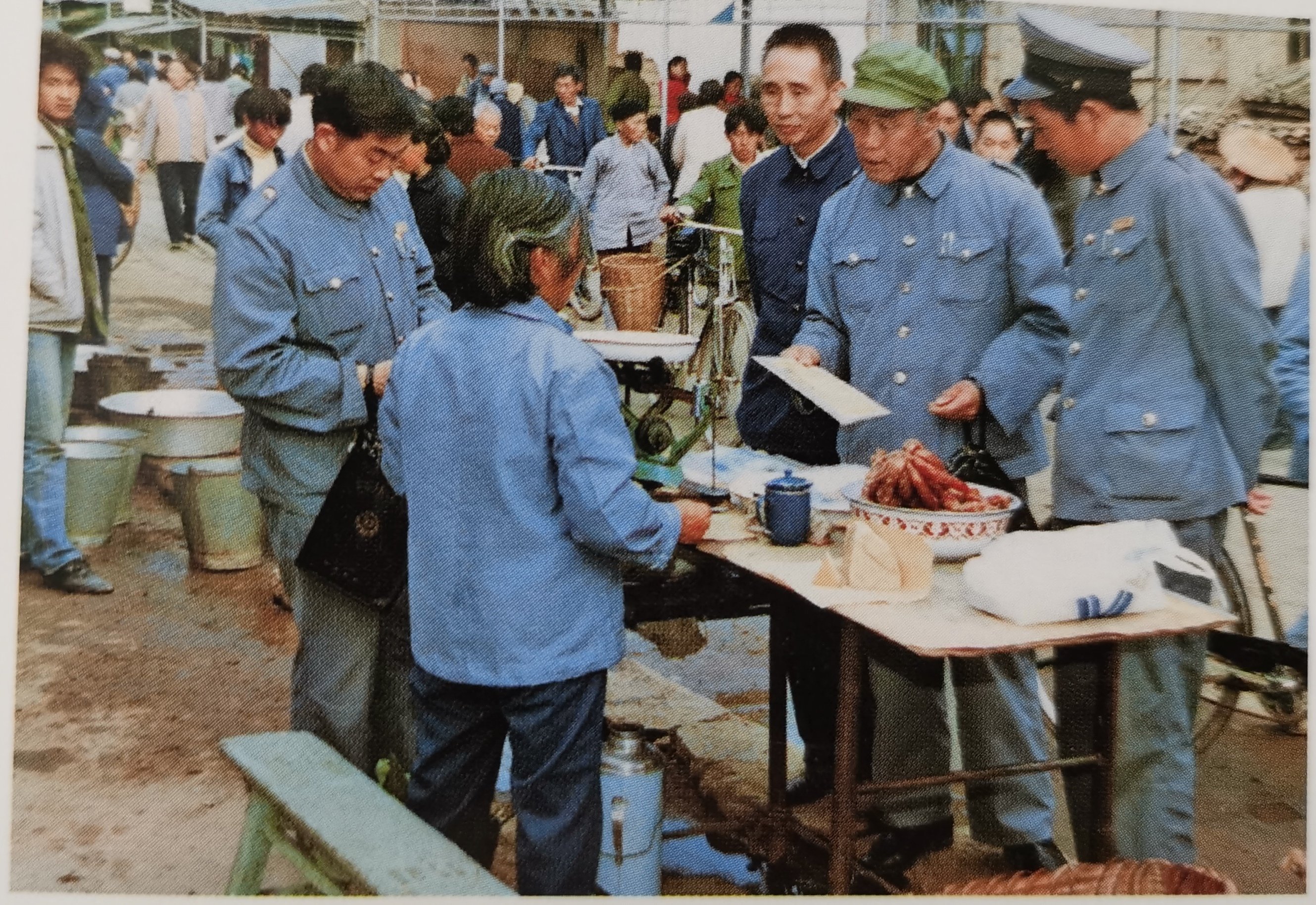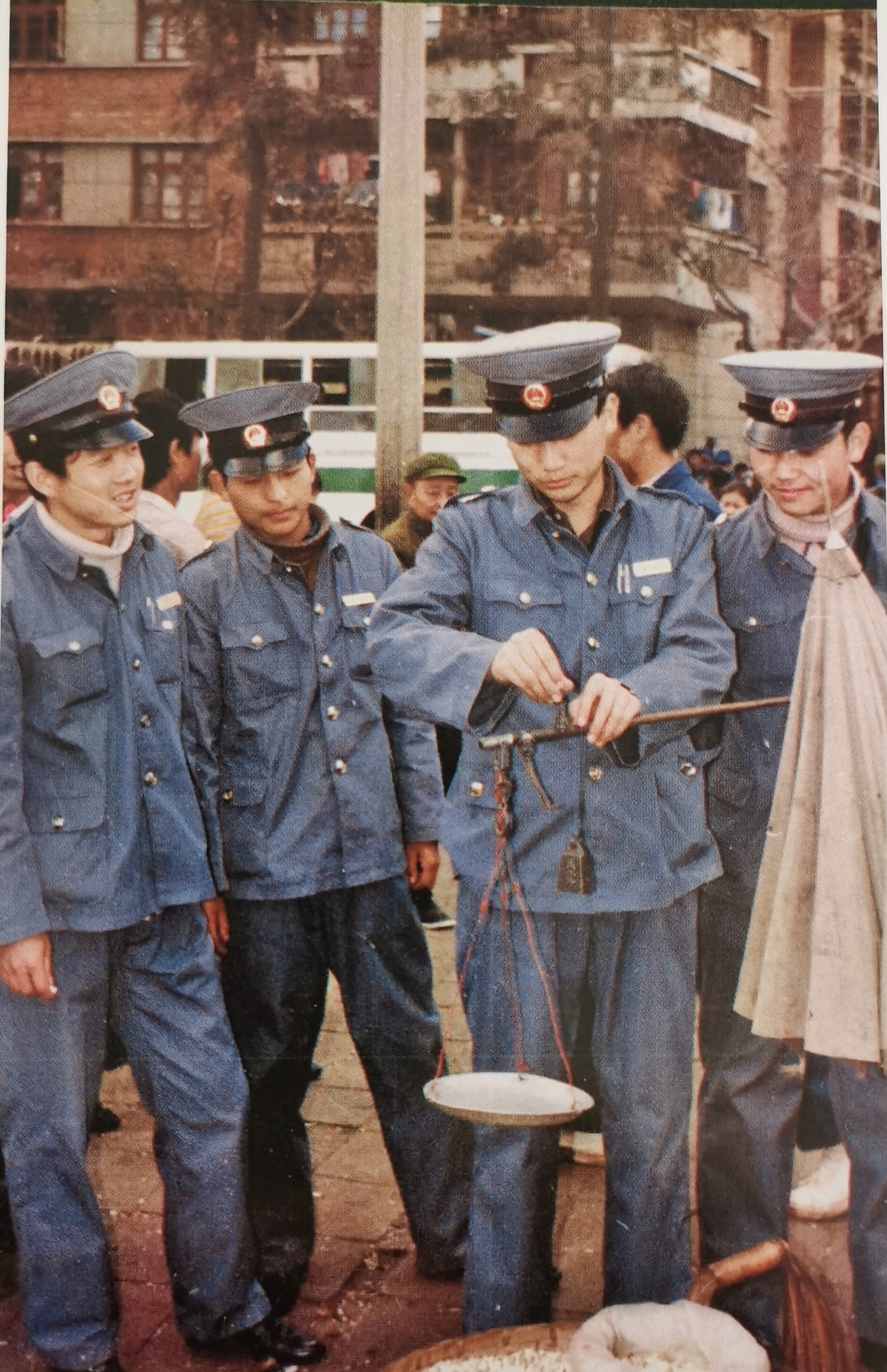 图为上世纪八十年代,昆明某县区工商局干部正在市场上进行检查。从照片上看,他们应该是在检查称对不对,是否存在缺斤少两。