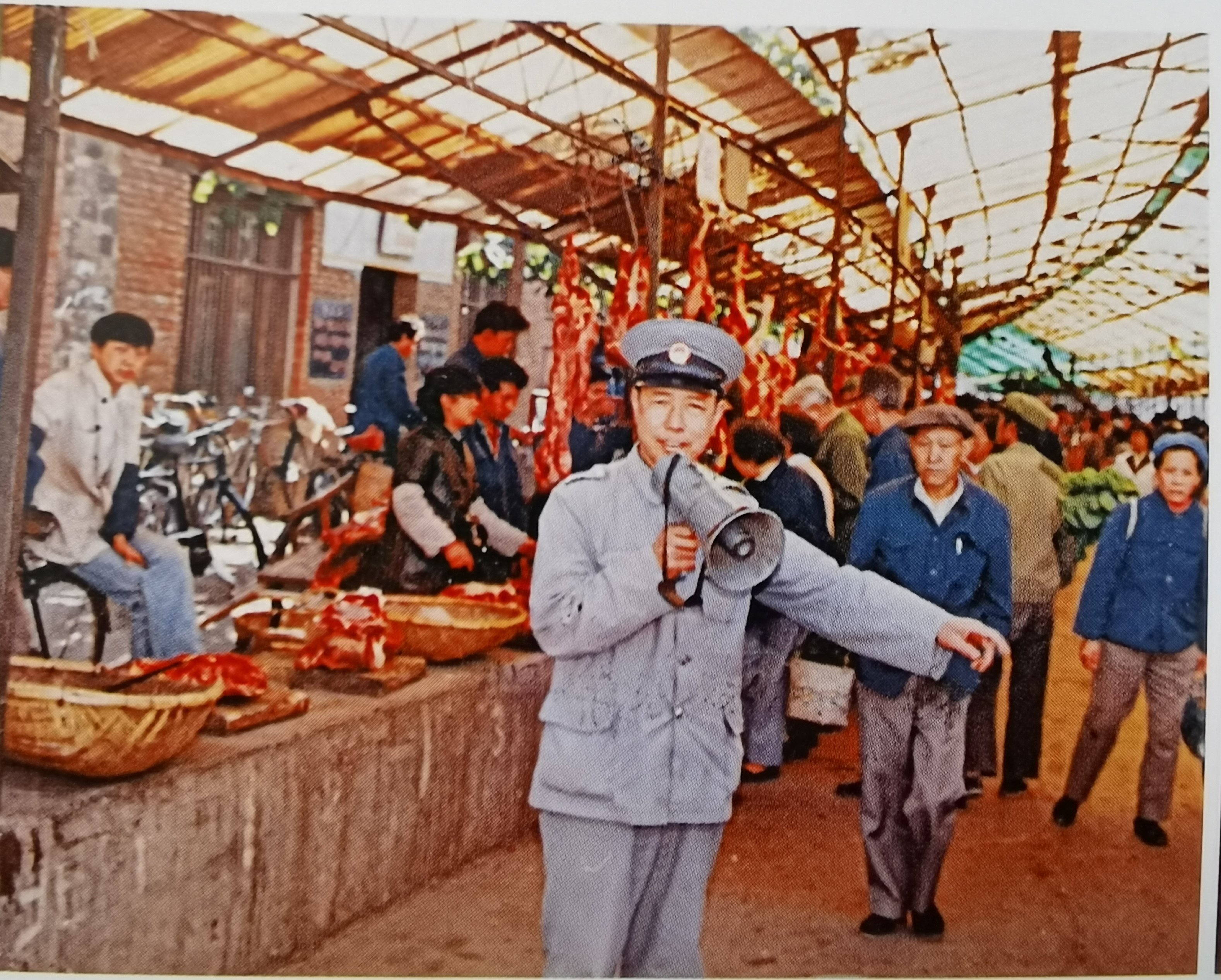 图为曲靖某县区八十年代的集贸市场。热热闹闹的场景十分亲切。一名工商干部拿着大喇叭正在维持秩序。