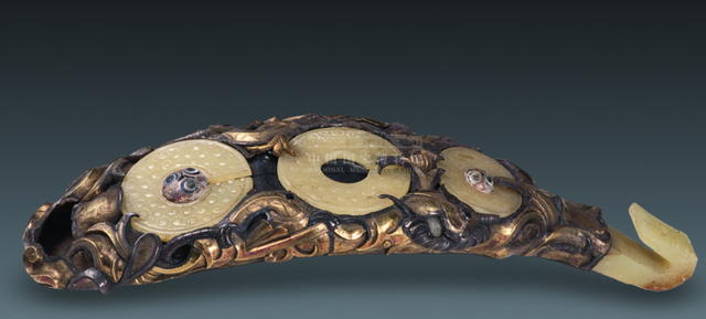 青白玉龙首钩,腹部琵琶式银鎏金浮雕嵌玉,腹端为夔龙首,嵌件脱落。腹侧高浮雕双夔龙身,钩腹镶嵌三件白玉谷纹玦,玉玦中孔各嵌入一件蜻蜓眼玻璃珠,其中一珠缺失。带钩是古代人身腰部佩带的装饰玉器之一, 早在新石器时代良渚文化中已出现玉带钩。