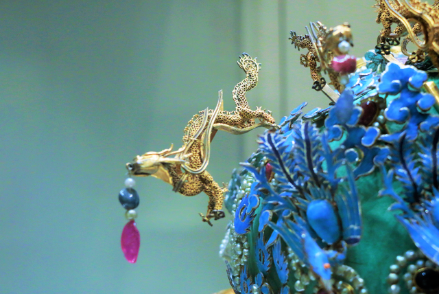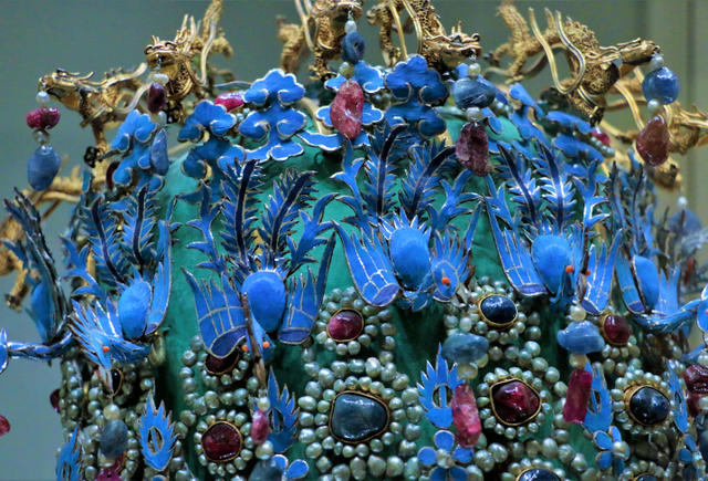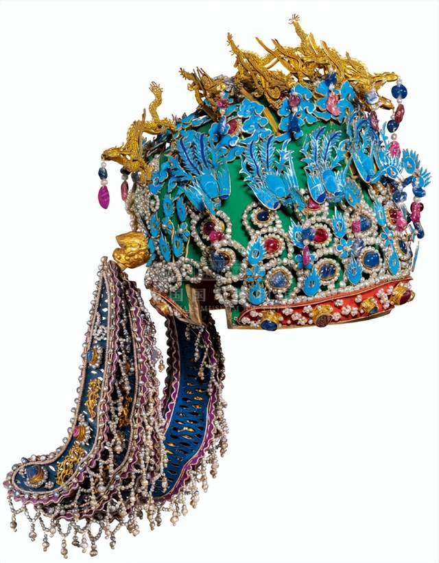 孝端皇后的这件凤冠,是用漆竹扎成帽胎,面料以丝帛制成,前部饰有九条金龙,口衔珠滴,下有八只点翠金凤,后部也有一金凤,共九龙九凤。金凤凤首朝下,口衔珠滴。