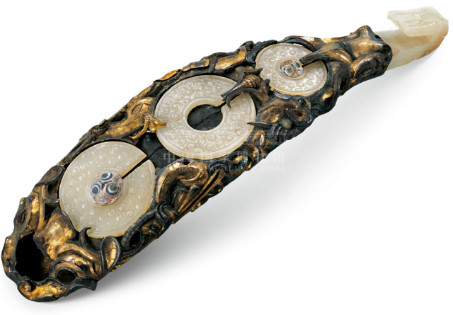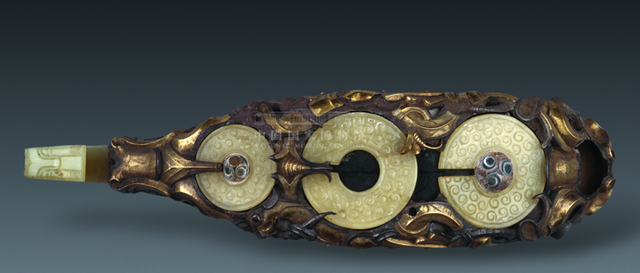 河南辉县城东固围村5号战国墓曾于1929年-1930年间被盗,部分文物流向日本和瑞典。这件器物代表了中国汉代金镶玉工艺的极美水平。其出土墓地的国别归属则是学术界迄今仍在讨论的话题。