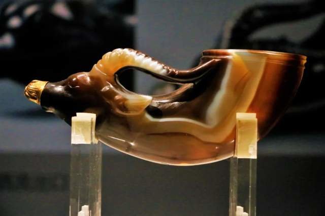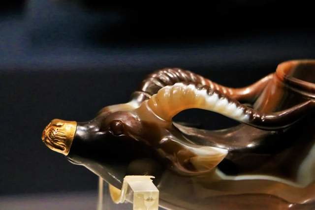 兽嘴处镶金,起到画龙点睛的作用,其实这是酒杯的塞子,取下塞子,酒可以从这儿流出。头上的一对羚羊角呈螺旋状弯曲着与杯身连接,在杯口沿下又恰到好处地装饰有两条圆凸弦,线条流畅自然。这件酒杯材料罕见珍贵,是极其稀有的缠丝玛瑙,材质纹理细腻,层次分明。