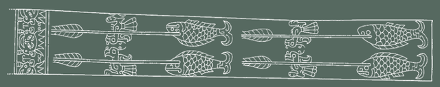 图案共分三组:靠近端头的一组,合拢看为两个前后对称,头戴五齿巫冠,耳饰三角形耳坠的人头像,笑容可掬。另外两组图案相同,其上下方分别皆是两背相对的鸟与鱼,在鸟的颈部和鱼的头部叠压着一支箭状物。
