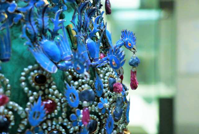 珠滴可以在走动的时候,象步摇那样随步摇晃。翠凤下有3排以红蓝宝石为中心的珠宝钿,其间点缀着翠兰花叶,冠檐底部有翠口圈,上嵌宝石珠花,后侧下部左右各饰点翠地嵌金龙珠滴三博鬓,博鬓上嵌镂空金龙,珠花璎珞,似金龙奔腾在翠云之上,翠凤展翅翱翔于珠宝花丛之中,金翠交辉,富丽堂阜。