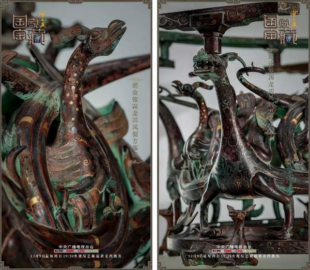错金银四龙四凤铜方案座集铸造、镶嵌、焊接等多种工艺于一体,复杂精巧,无以复加。