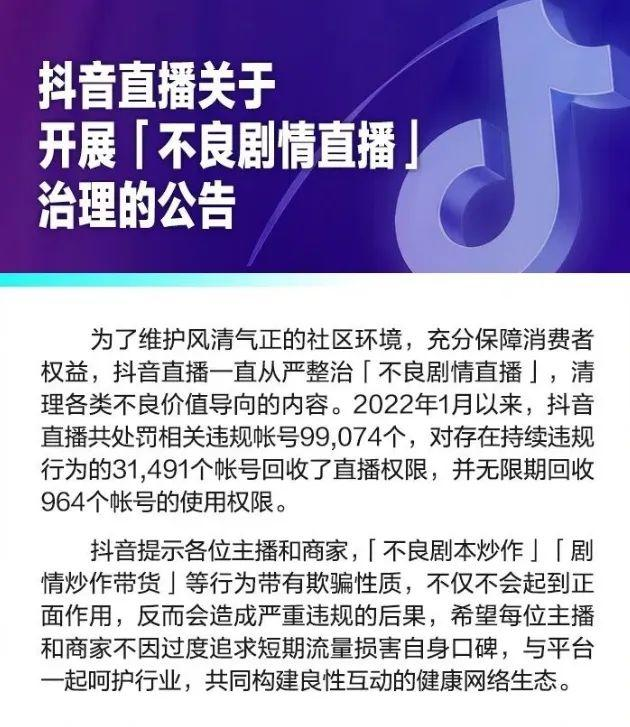 对此,抖音面向主播和商家做出提醒,“不良剧本炒作”“剧情炒作带货”等行为带有欺骗性质,不仅不会起到正面作用,反而会造成严重违规的后果,希望每位主播和商家不因过度追求短期流量损害自身口碑。