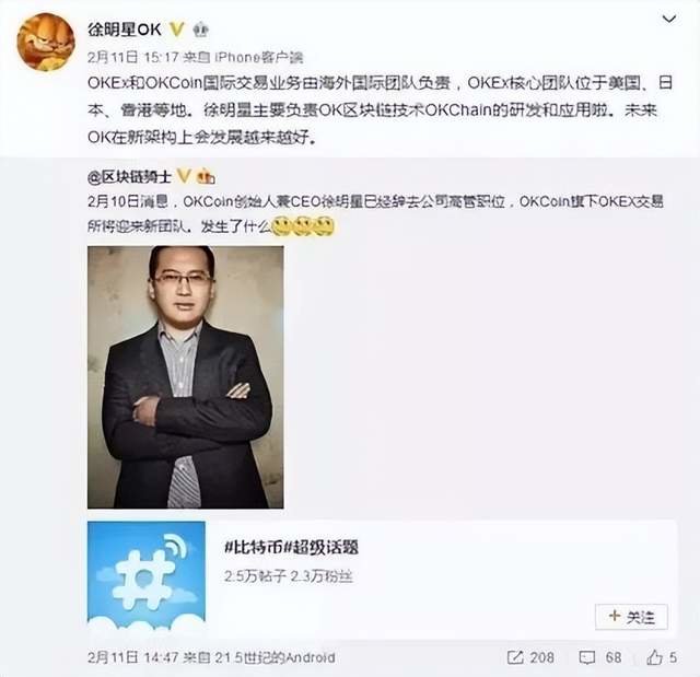 此前不久,多名在虚拟货币交易平台OKEx上进行合约交易的投资者聚集到OKCoin公司楼前讨要说法,一度将徐明星推向舆论的风口浪尖。而对此,OKEx表示,徐明星从未在自己公司任职,与自己无关。
