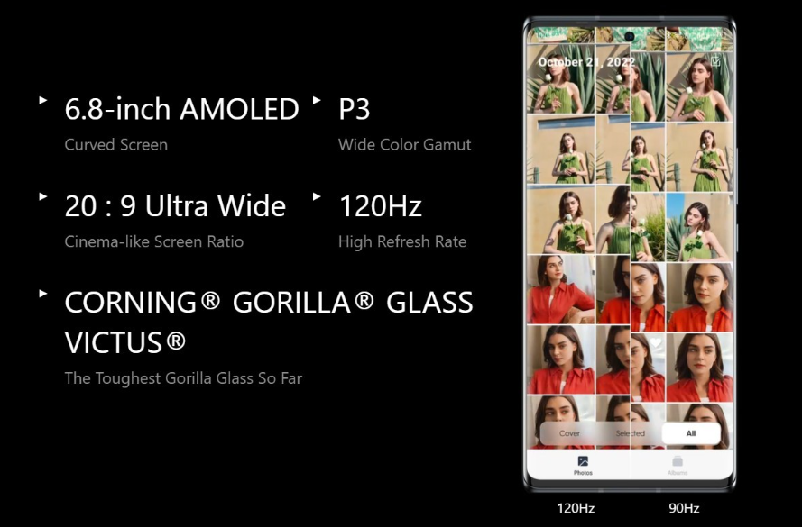 屏幕方面,Tecno Phantom X2 / Pro 系列搭载了 6.8 英寸 120Hz(上一代为 90Hz)AMOLED 屏,具有 FHD+ (20:9) 分辨率,覆盖有康宁大猩猩 Victus 玻璃。