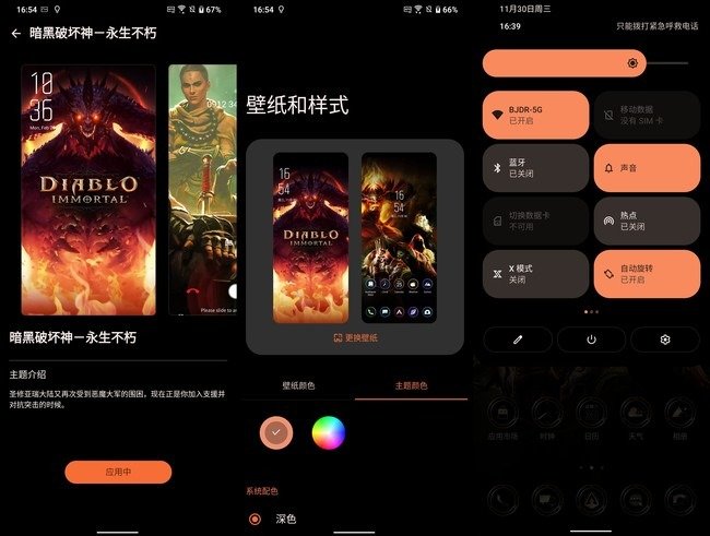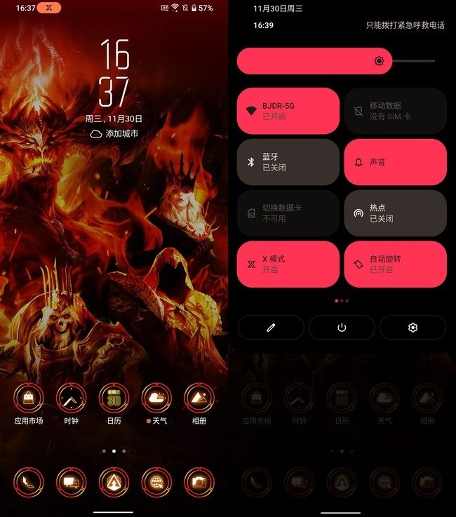 进入系统则可以看到专属的界面UI,在普通状态下整体呈现出橙色的设计,而图标则呈现出金色,背景图也比较多彩,而在开启X模式后,整体的UI配色由金色转变为红色,背景图也呈现出红色的燃烧效果,更具战斗氛围,充电指示也呈现出迪亚波罗圆环设计。