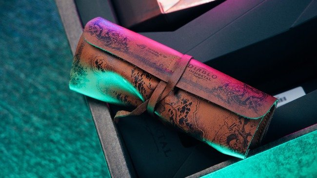 除此之外,手机的右侧则有着一个配件包,其包装则是皮革的质感,让其复古味道提升,而包装外部则画着是庇护之地世界图,结合皮革的质感,还原了游戏那种古典时代的地图,诚意满满。包内则是手机充电器和充电线。