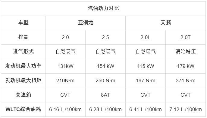 动力方面,亚洲龙拥有2.0L发动机+CVT变速箱、2.5L发动机+8AT变速箱、2.5L发动机+E-CVT变速箱三套不同动力系统,前两款为汽油动力,后者为混合动力。天籁则目前只提供了汽油动力总成,分别是2.0L自然吸气发动机+CVT变速箱,以及2.0T涡轮增压发动机+CVT变速箱。