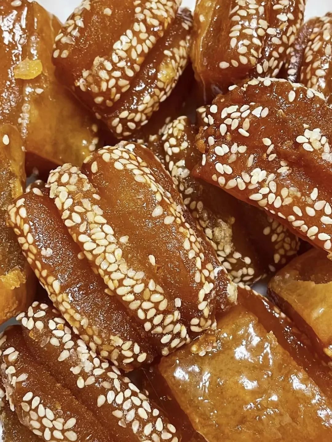 正宗的蜜三刀有一层亮亮的糖衣,浆亮而不粘,芝麻香味浓厚,吃起来十分弹牙,轻轻地咬开一角,慢慢吸入软软的透明的饴糖,吃起来甜而不腻。