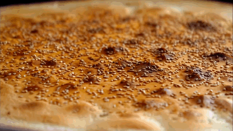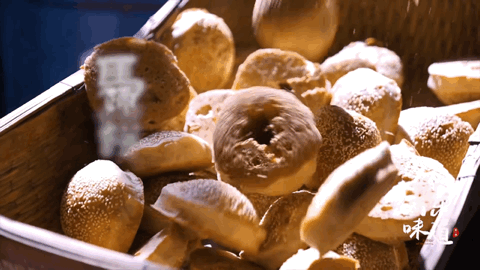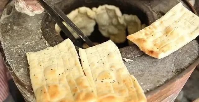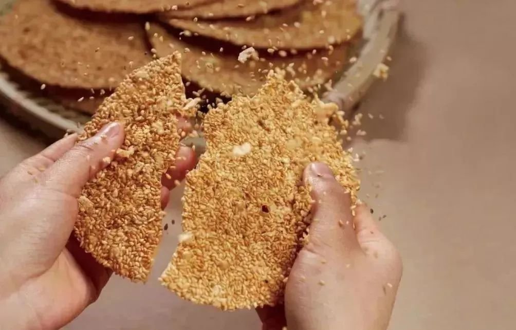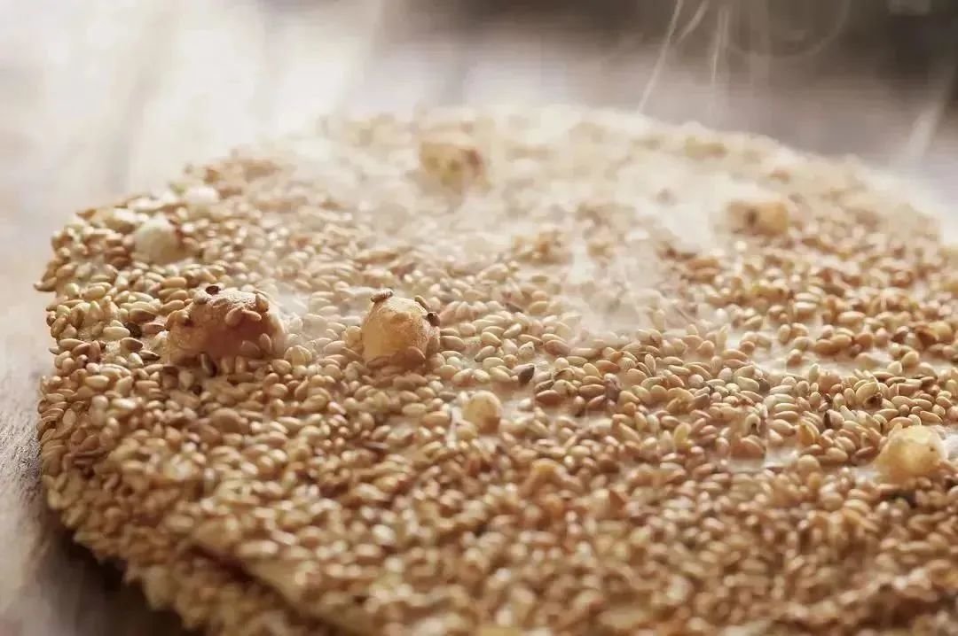 大小的面团轻柔几下,瞬间变得薄如蝉翼,沾满芝麻的薄饼贴在炉壁内,一出炉,香脆的口感就使人欲罢不能。