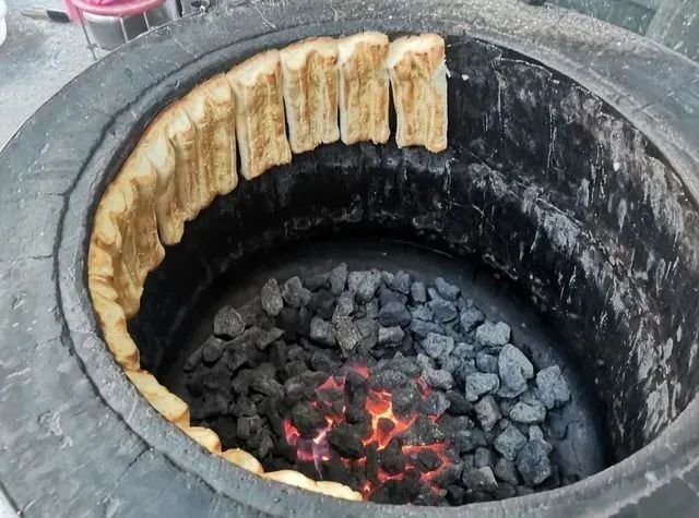 烤制过程中,将面胚依次贴满缸壁,盖上炉盖,不一会儿,缸内就会溢出香味。刚出炉的缸贴筋道利口,香酥怡人。