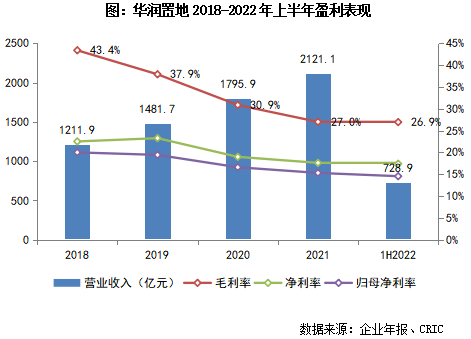 2022年上半年,华润置地实现合同销售金额1210.4亿,同比下降26.6%;销售面积587万平方米,同比下降39%。