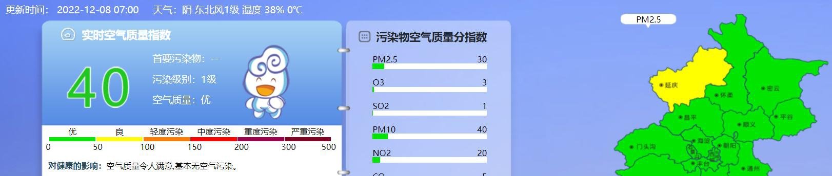 据北京市生态环境监测中心今早7时数据,目前实时空气质量指数40,污染级别1级,空气质量优。