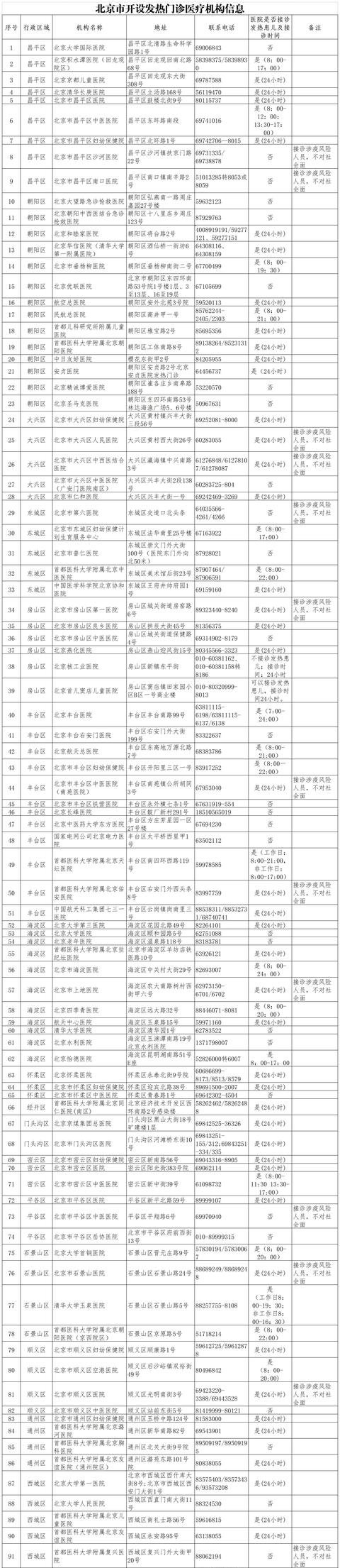 北京市公布94家发热门诊医疗机构名单