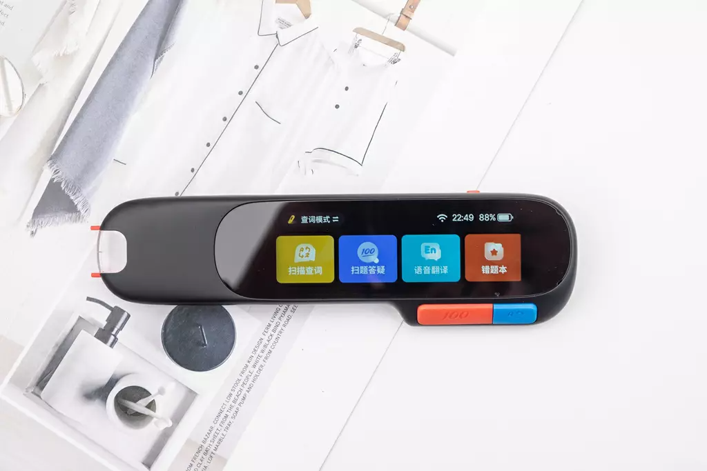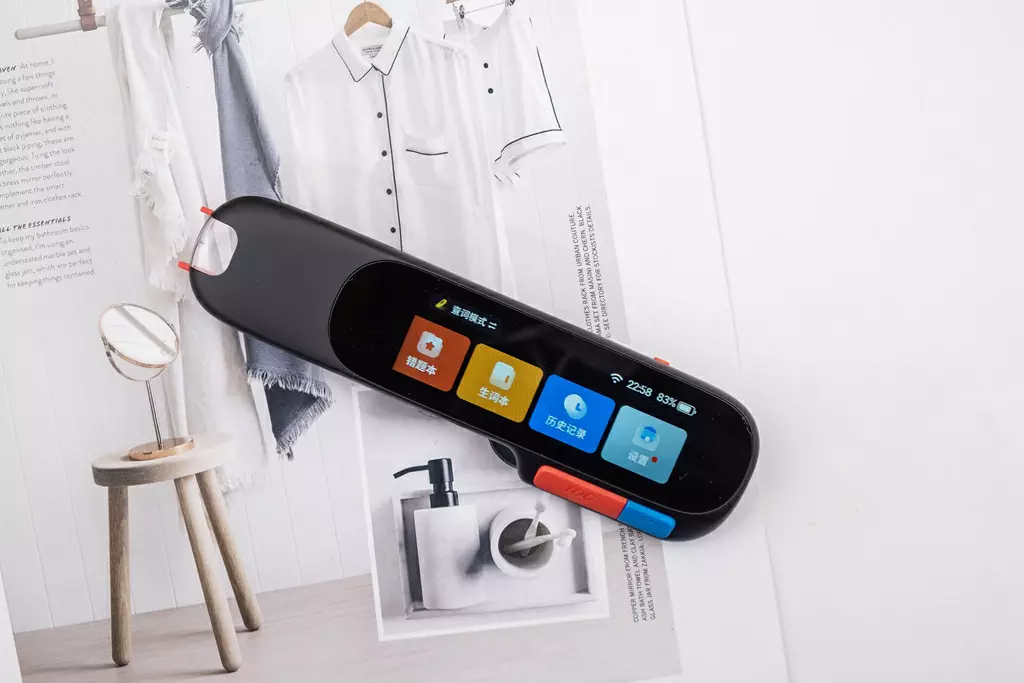 了解完喵喵机学习笔S1的外观设计和操作,接下来说说功能部分,开机之后,简单的设置就可以直接进入菜单中,提供了多个实用功能,包括扫描查词、扫描答疑、语音翻译、错题本、生词本、历史记录和设置,都是以大图标显示,直观易看,下面来聊聊其中几个功能。