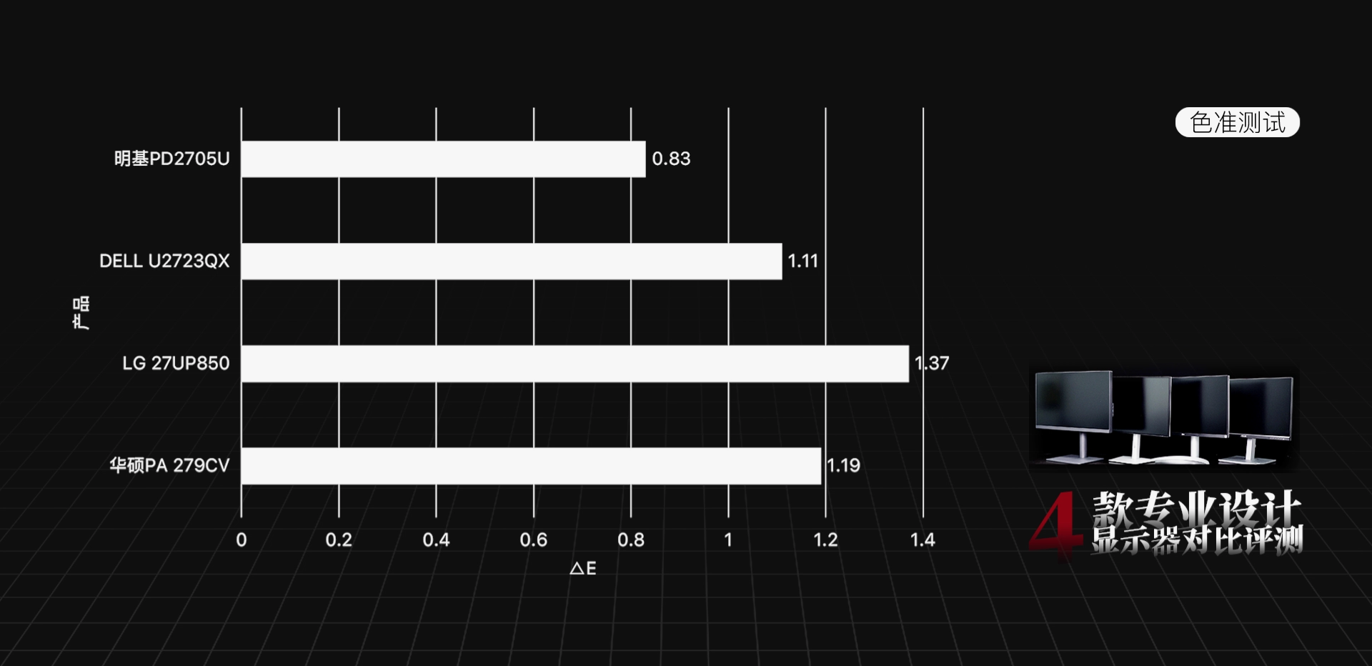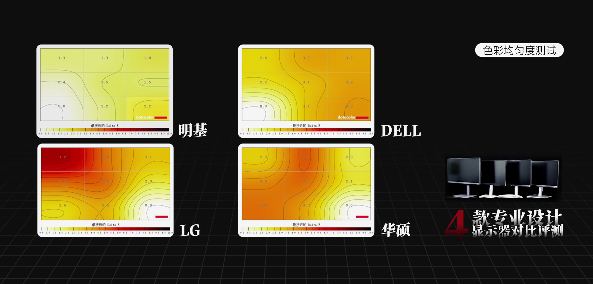 最后来总结一下这4款专业设计显示器。在色准方面,4款产品都具备很高的水准,ΔE都控制在2以内。在色彩均匀度方面,明基的表现要更好,DELL和华硕也还不错,LG在均匀度方面要略逊一些。接着是关乎用户体验和工作效率预设设计模式,以及产品的品牌背景,综合来看,我们会更推荐明基和华硕这两款。