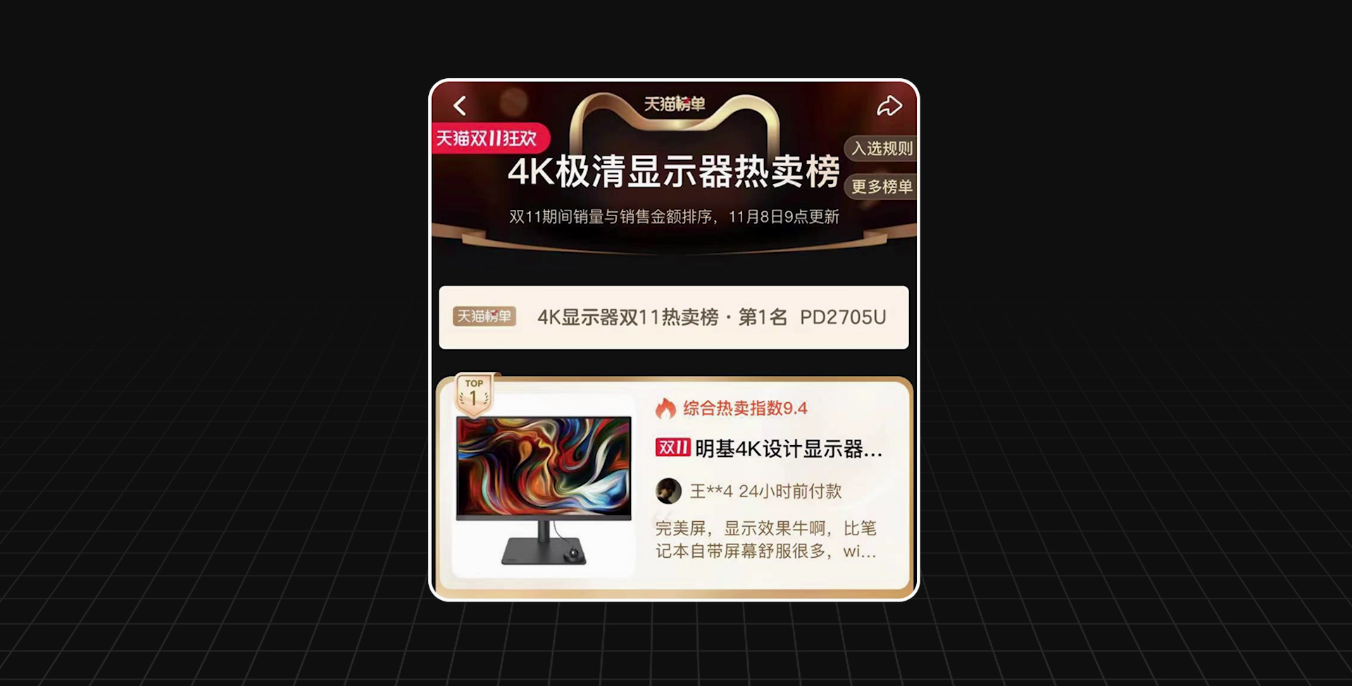 明基PD2705U的实力要更突出一些,尤其是色彩实力,小热盘也是它的特色功能,明基PD系列的口碑一直不错。事实证明大多数设计师也是这样想的,双十一的时候我留意了一下显示器的榜单,明基PD2705U冲到了第一的位置。