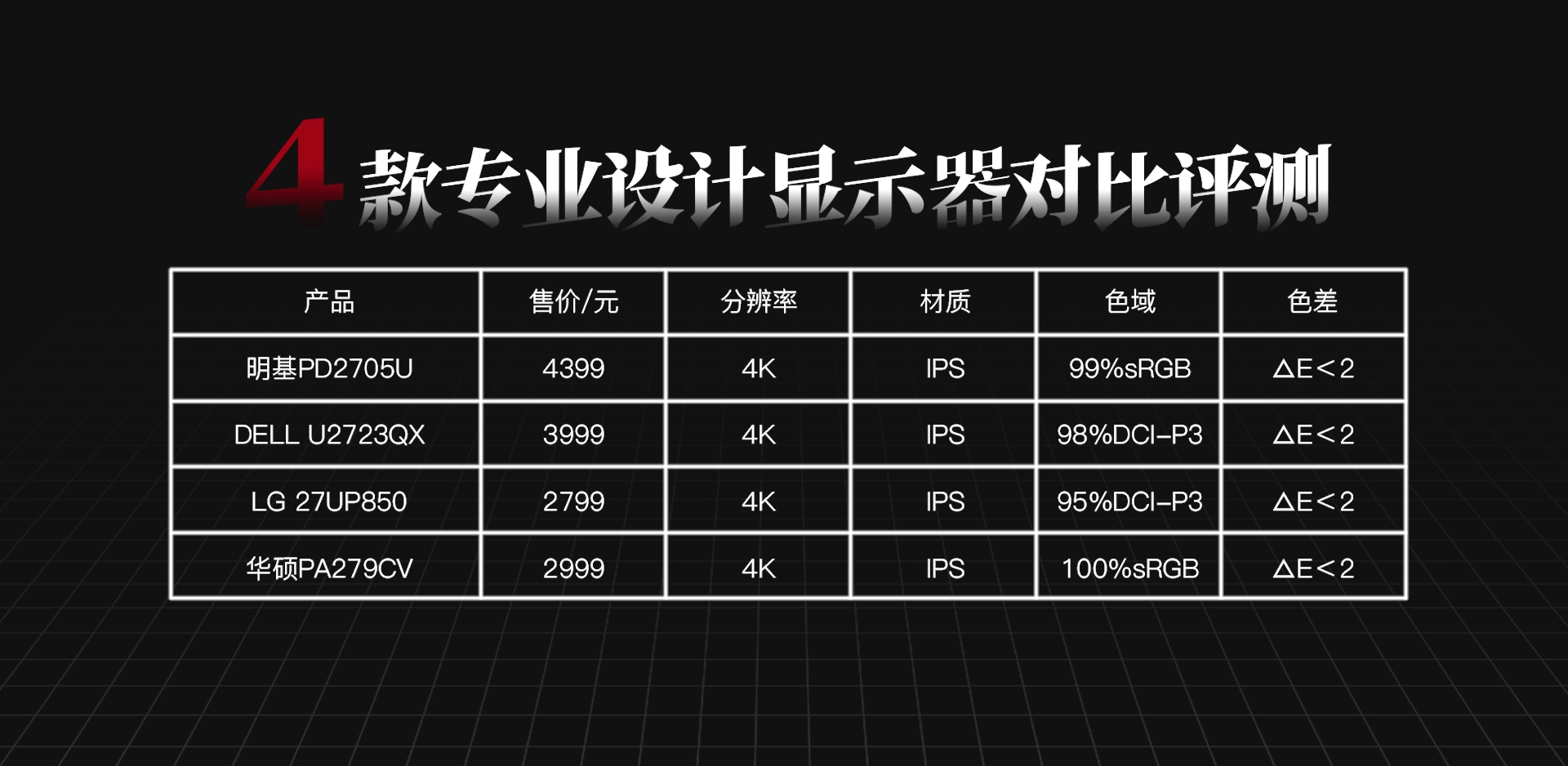 关于这4款显示器的硬件参数对比,我们已经整理好了,有需要的话可以直接保存。接下来,我们将从色准、用户体验、色彩均匀度、品牌背景这四个方面来进行对比。