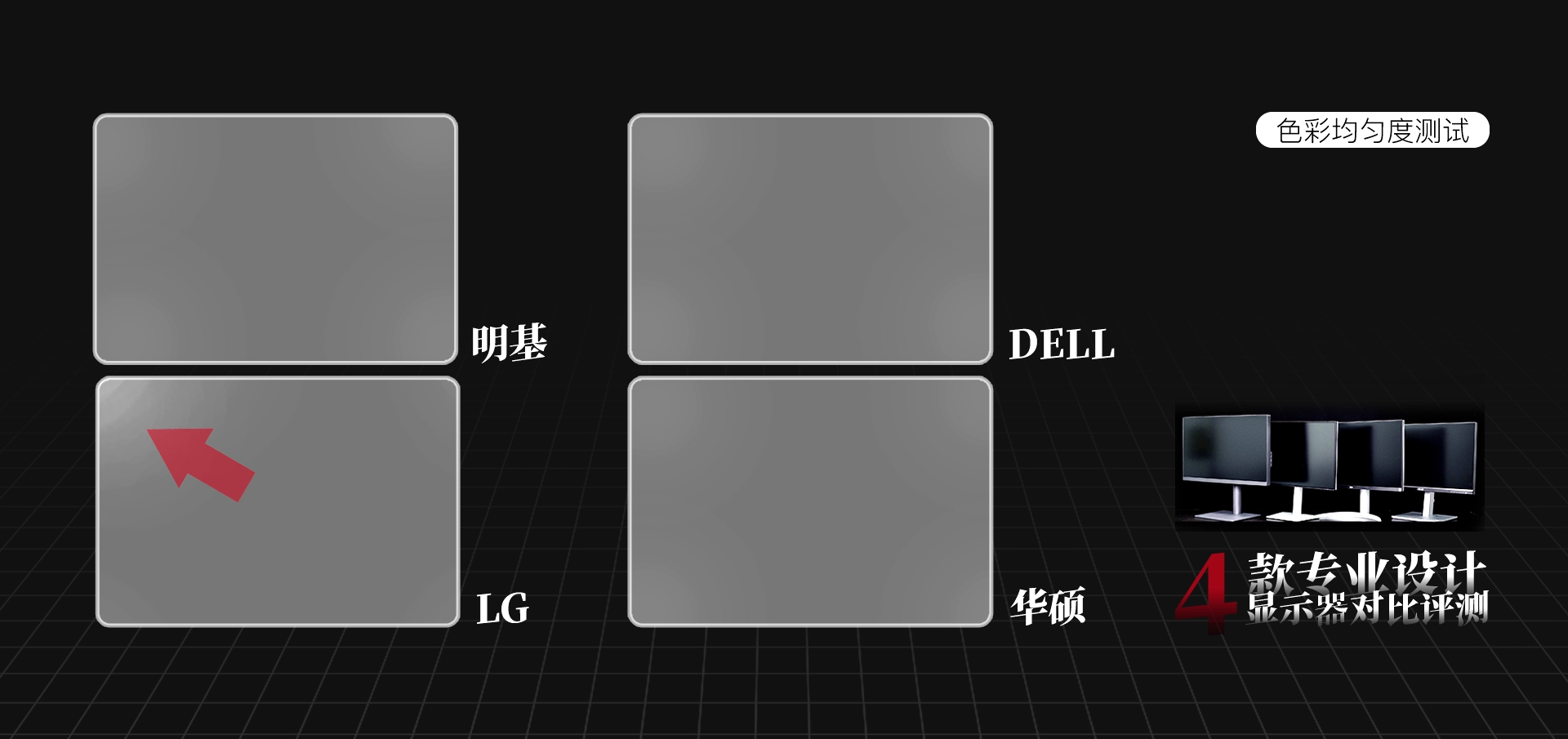 除了用仪器进行测试,我们主观上也能感受到一些差异。比如说将这四幅画面中心区域的色彩调整到人眼看起来很接近的效果,然后再把中心区域挪到边角(左上角)位置,明基、DELL、华硕这三款是比较接近的,LG的色彩能看出来明显的偏差。