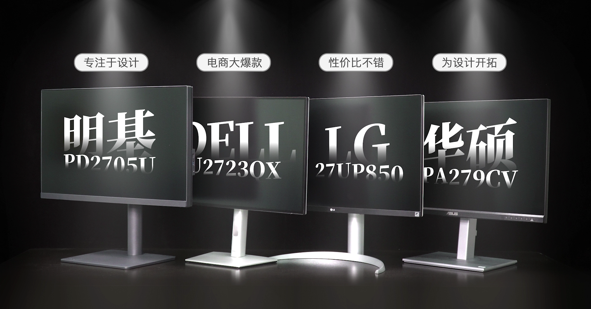 我们这次选择的4款产品分别是:明基PD2705U、DELL U2723QX、LG 27UP850、华硕PA 279CV。4款产品也是各有特色:明基是唯一一个专注于做设计的显示器品牌,DELL的这款属于大爆款、LG在这个类目中属于性价比比较高的品牌、华硕的这款则是专为设计师开拓的型号。