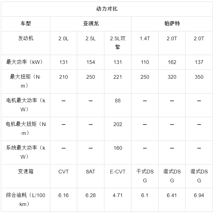 消费者如果关注汽油动力,那么亚洲龙的自然吸气发动机具有更平顺的出力特性,动力输出线性细腻,而帕萨特涡轮增压发动机在涡轮介入时,具有更强的爆发力,但油耗也稍高一点点,而且95号汽油价格也更高一些。但如果关注混合动力,那么无疑亚洲龙就是最好的选择,毕竟帕萨特没有混动(PHEV属帕萨特新能源产品序列,不再对比范围内)。