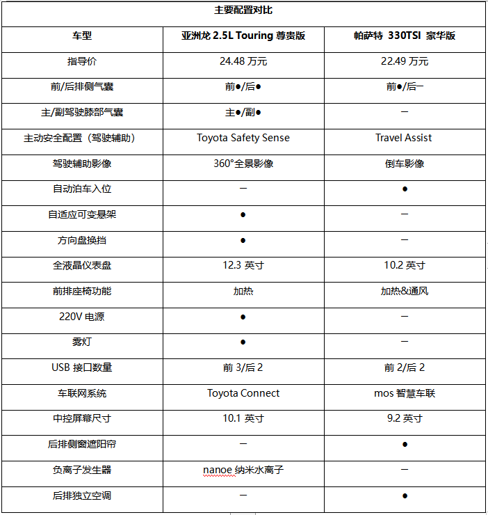 然后看一看两款车型在配置方面的差异,选择亚洲龙2.5L Touring尊贵版,对比帕萨特 330TSI 豪华版,售价相差2万,基本也算是棋逢对手。