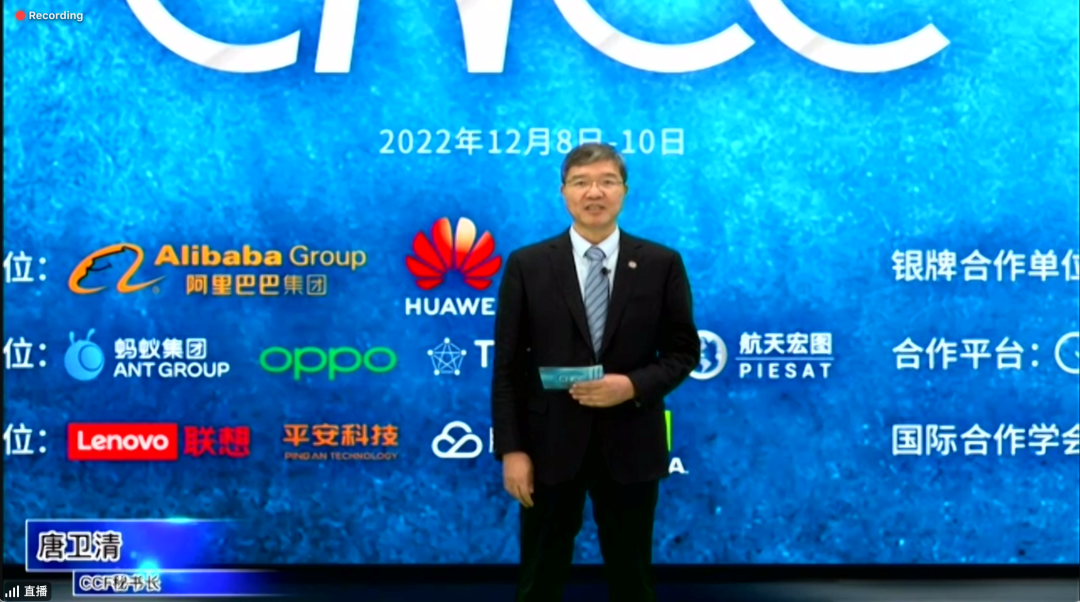 梅宏理事长在致辞中动情地谈到:今年的CNCC采用全线上的方式,这是“尝试”的选择,人类的许多创新是在应对“无奈”的尝试中倒逼出来的,CCF的数字化转型正在起步,这也是面向未来学术交流和知识传播新模式的一次探索,希望通过这次大规模“线上”会议的实践为CCF建设数字化平台、为会员提供常态化知识服务新通道积累有益的经验。然而,无论是基于什么原因做出的选择,这次会议都将以“首次全线上”而载入CCF和CNCC的史册,我更希望,这次会议将以“唯一全线上”而留下CNCC史上一份“里程碑”式的记忆。这份“记忆”承载了我们的疫情三年,特别是2022年,其中有难以忘怀的希望,以及在希望驱动下为办一次独特盛会而殚精竭虑的付出,更有无可奈何的失落,以及在失落心情下积蓄的对来年CNCC的更高期盼!我始终相信,无论如何恐惧和躲避,我们终将依赖科技创新直面病毒并走出疫情;我始终相信,无论信息技术如何进步,人类作为社会性动物对面对面聚会交流的需求一定是永恒的。丰富的生命形态共处地球是客观现实,更是和谐自然。科技发展也应该以人为中心,以服务人类发展为最高准绳。最后,梅宏感谢所有的CCF会员和CNCC参会者,他说没有你们的关注和支持,就没有CNCC的盛况和CCF的成长。预祝首次“线上”CNCC圆满成功!期待我们来年相会于CNCC2023,我希望也相信这一定是一场线下的超大规模的IT行业盛会。