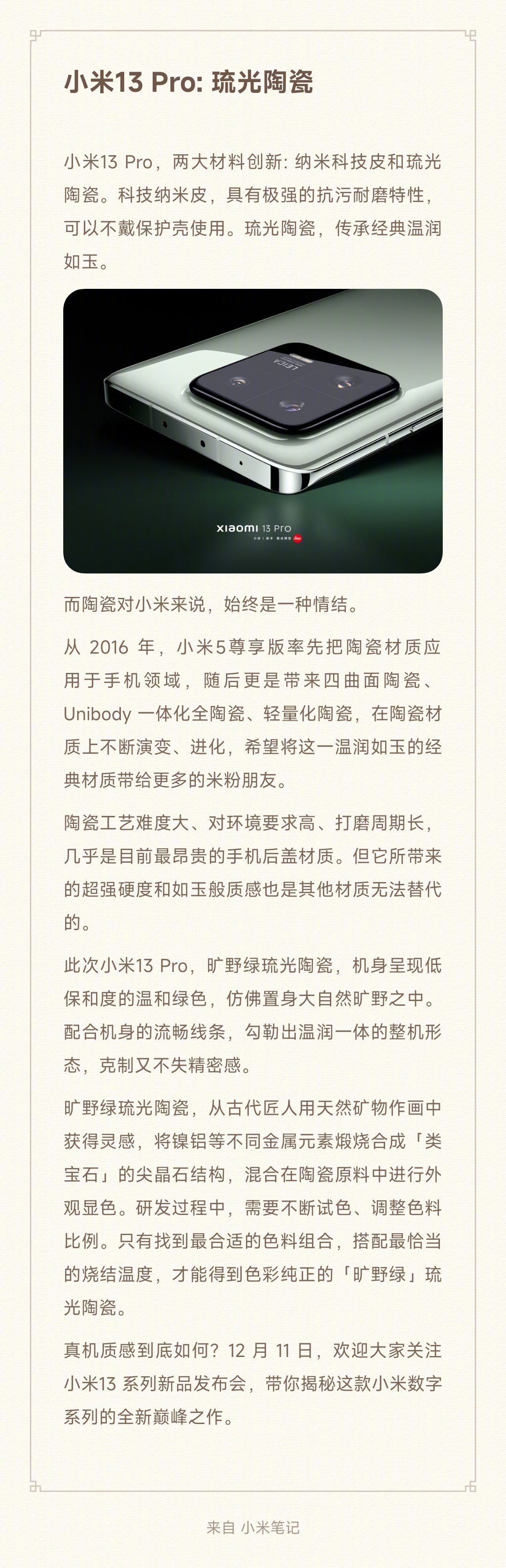 小米 13 Pro,旷野绿琉光陶瓷,机身呈现低保和度的温和绿色,仿佛置身大自然旷野之中。配合机身的流畅线条,勾勒出温润一体的整机形态,克制又不失精密感。旷野绿琉光陶瓷,从古代匠人用天然矿物作画中获得灵感,将镍铝等不同金属元素煅烧合成「类宝石」的尖晶石结构,混合在陶瓷原料中进行外观显色。研发过程中,需要不断试色、调整色料比例。只有找到最合适的色料组合,搭配最恰当的烧结温度,才能得到色彩纯正的「旷野绿」琉光陶瓷。”