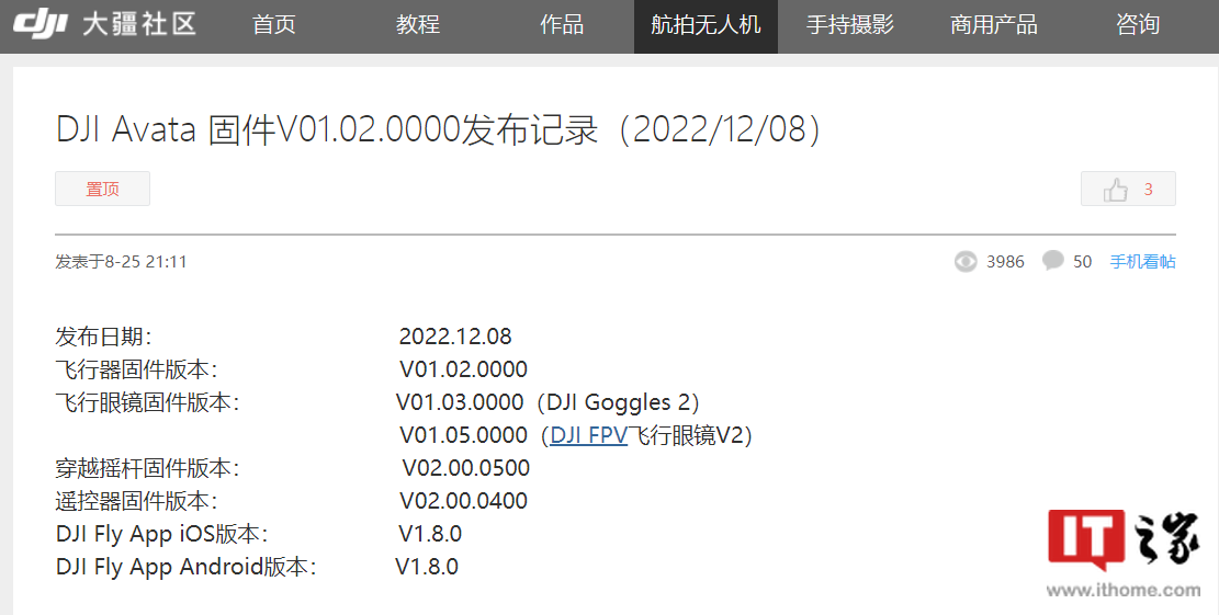 IT之家 12 月 8 日消息,大疆为 DJI Avata 无人机推送了 V01.02.0000 固件更新,带来了手动档模式和 30 帧拍摄。