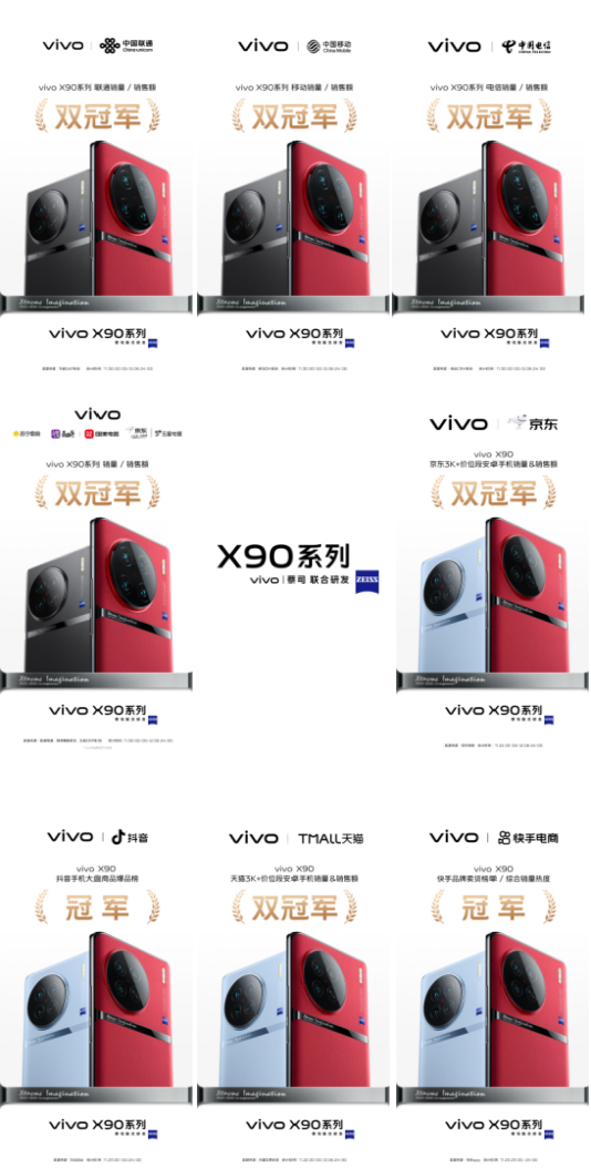 目前,X90系列已全面开售,市场热情持续高涨,线上和线下渠道均出现不同程度的流量高峰。凭借出色表现和过硬口碑,X90系列一举拿下中国联通、中国移动、中国电信、苏宁易购、国美、京东等多个渠道的销量与销售额“双冠军”。其中,被媒体和消费者赞誉为“最强标准版旗舰”的X90也强势上榜,成为天猫、京东平台3K+价位段安卓手机销量与销售额“双冠军”,同时还坐稳抖音手机大盘商品爆品榜、快手品牌卖货榜单与综合销量热度等多个平台榜单的“冠军”席位。