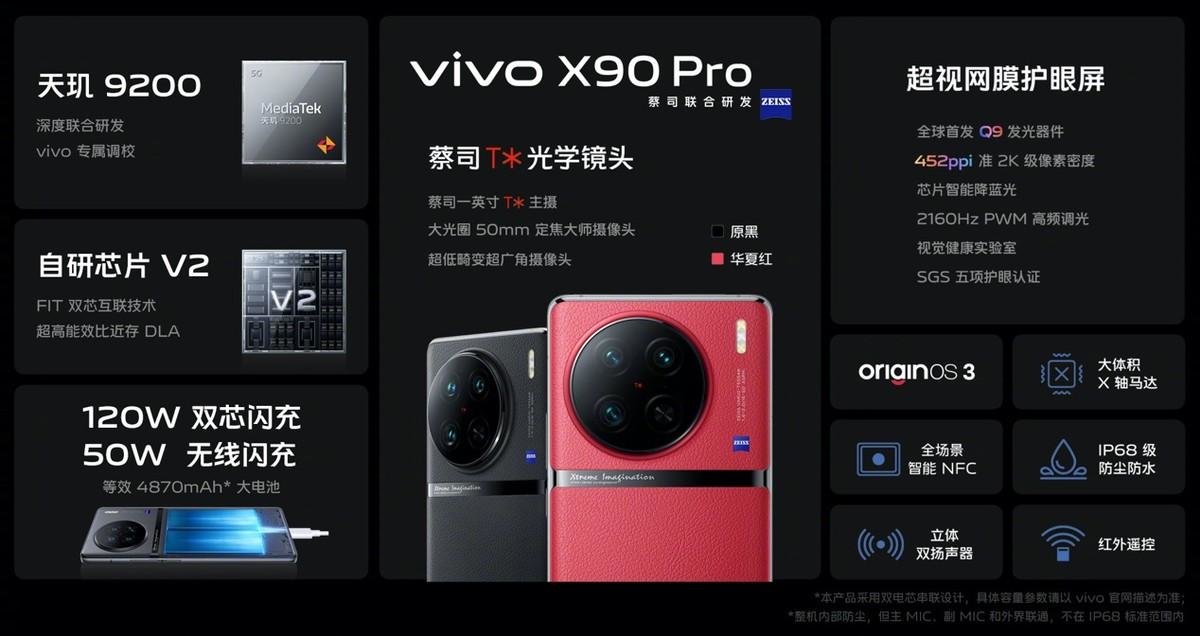 作为vivo X系列的最新一代产品,X90 Pro搭载了vivo自研芯片V2,采用自研FIT双芯互联技术,与天玑9200完美适配。新一代自研芯片V2从内存单元、AI计算单元及图像处理单元三大板块进行了重构,实现了超高速协同、超高速缓存、超高能效比,能为用户的影像体验、存储传输体验带来明显优化和提速。
