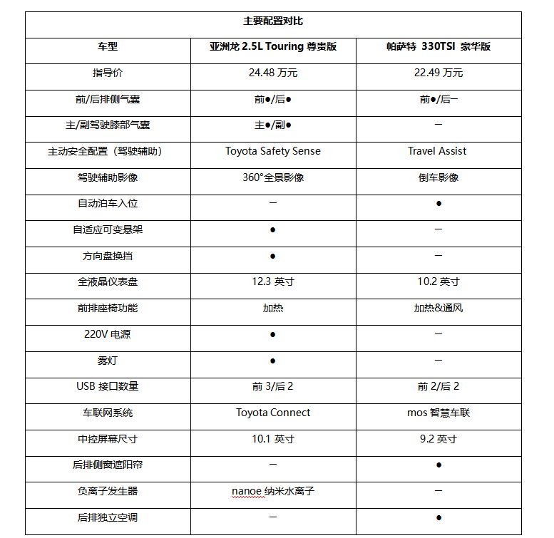 在其他舒适性和便利性配置上,虽然两款车型互有胜负,但亚洲龙整体赢面更多一点,比如AVS自适应可变悬架(2.5L汽油版车型标配),自适应调节减震器阻尼,进一步兼具操控性和舒适性,具有更犀利的底盘表现。帕萨特则拥有前排座椅通风,后排独立空调与后风挡遮阳帘,后排表现更出色一些。