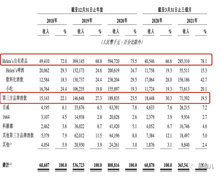 据海伦司招股书显示,2018年至2020年,自有产品收入占比为72%、68.8%、73.5%,与之相对的是第三方品牌酒饮收入占比为22.1%、27.3%、23.5%。