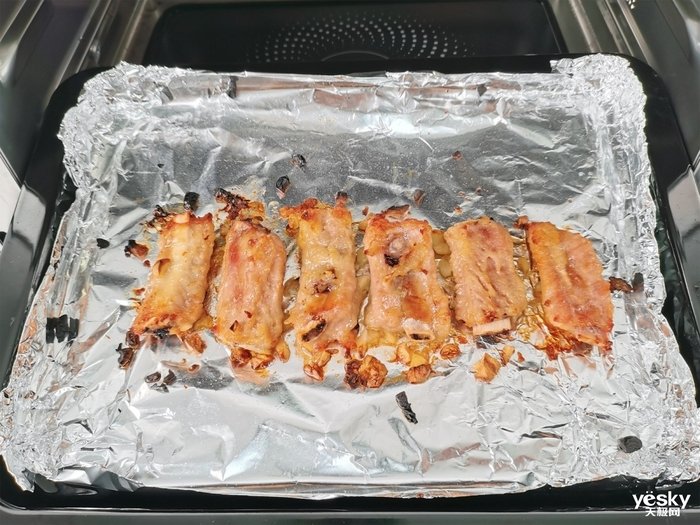 经过简单的操作,一道又脆又嫩的蒸烤排骨就出炉了,表面金黄,又饱含水汽,脆中带嫩,口感一流,咬进去的时候肉汁饱满,没有流失。
