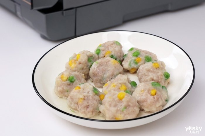 我们准备了玉米青豆猪肉丸一盘,肉丸也是稍大块的肉类,熟透需要较高温度。