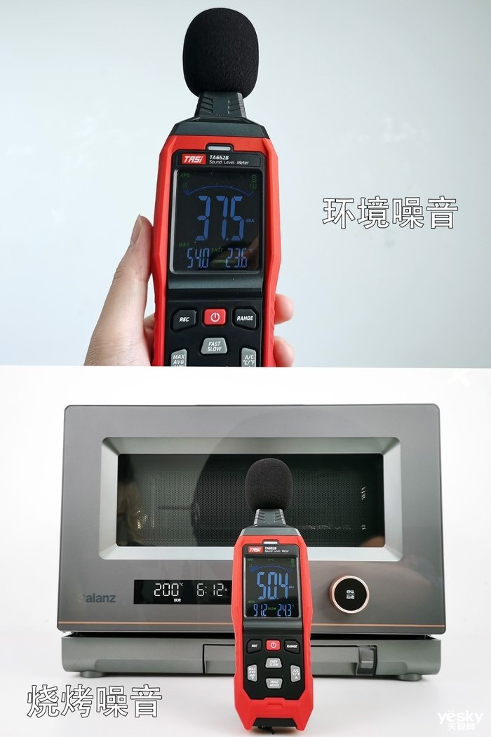 烧烤/烘烤是一个时间比较长的烹饪过程,通常噪音也会大一些。因此我们测试了烧烤过程中的噪音。我们测得关机时的环境噪音约37.5分贝,进行烧烤时在机身近距离测得约50.4分贝,这是可以算安静的数值,比人说话声音小(通常约60分贝),出了厨房距离更远相信声音会小得听不见。