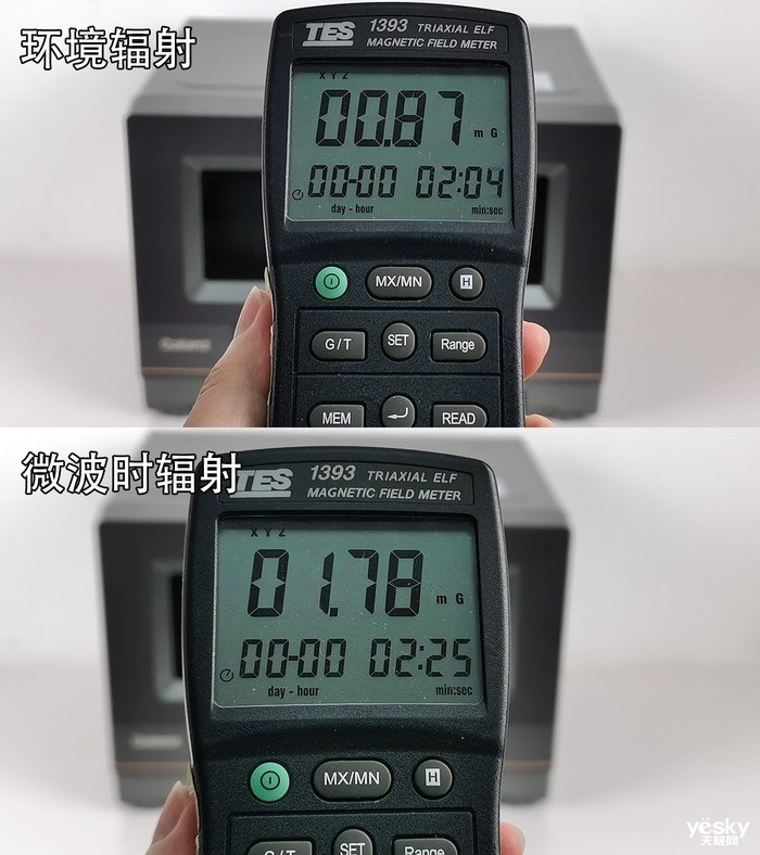 电器在工作时会产生电磁辐射,当电磁辐射超过一定强度时就构成了“电磁污染”,会使人头疼、失眠、血压异常等。我们使用电磁辐射测试仪测试,环境基准辐射约0.87豪高斯。格兰仕G0-RTQF2V进行微波加热时,在距离约1.5米处,测得数值约1.78豪高斯,在0-2之间变动。这一距离的数值在安全范围,不会影响家庭环境、人体健康。