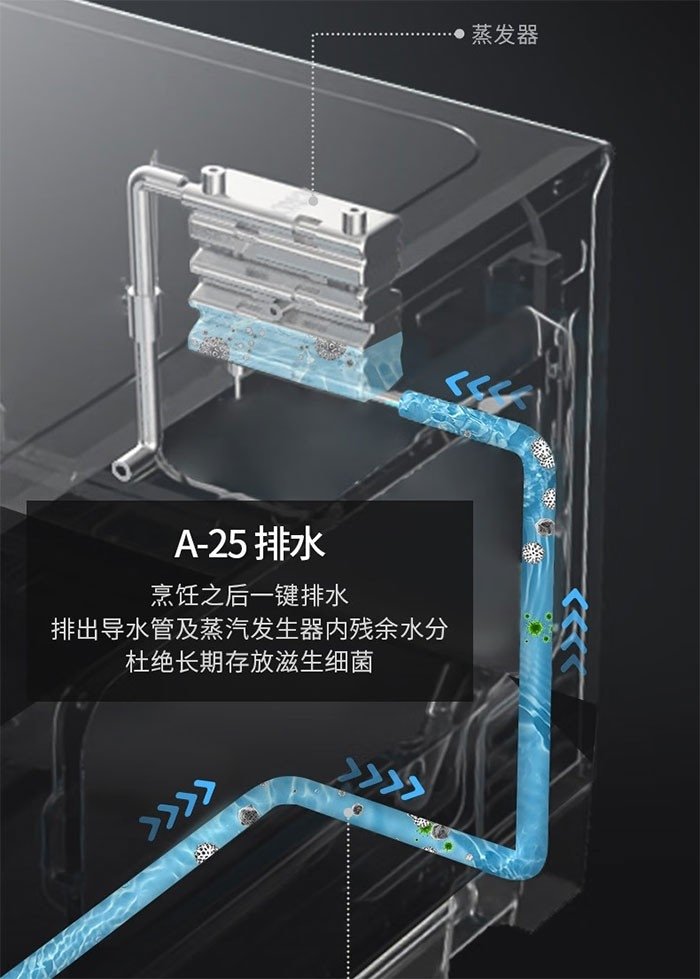 一般蒸烤箱里的水(特别是导水管等内部水路里的残余水),如果没有及时清理,时间长了容易滋养细菌,发出异味。格兰仕G0-RTQF2V拥有“一键排水”功能,可以排出导水管与蒸发器内的残余水分,避免细菌滋生。