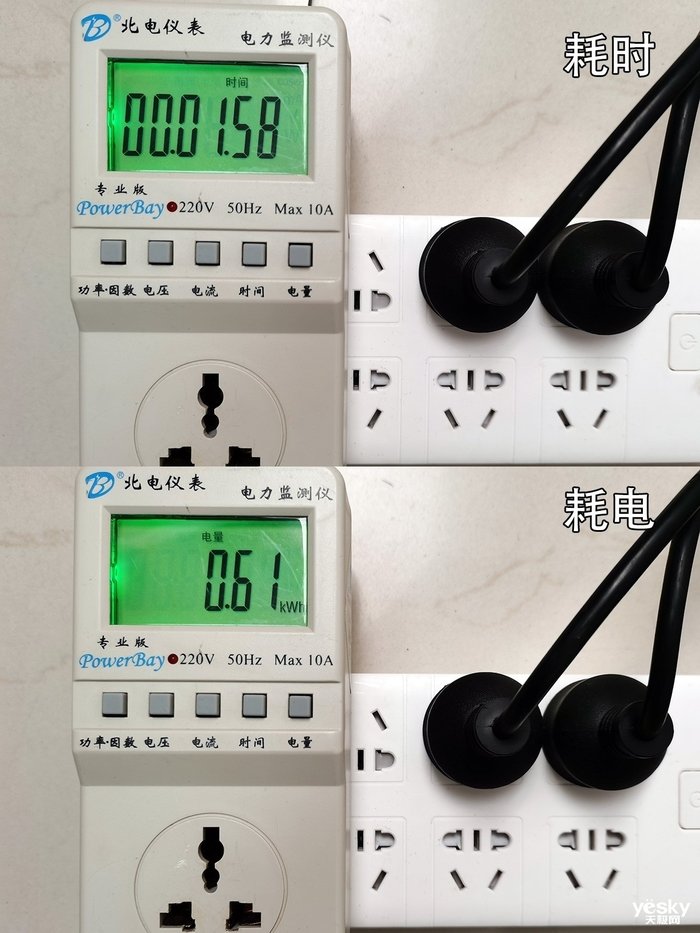 评测过程中,我们也测试了耗电量。测试耗电时间约2小时,期间进行了约半小时的蒸汽烧烤,半小时的微波蒸汽,待机约一小时,最终测得耗电量为0.61度(kWh)。与同类产品相差不大。