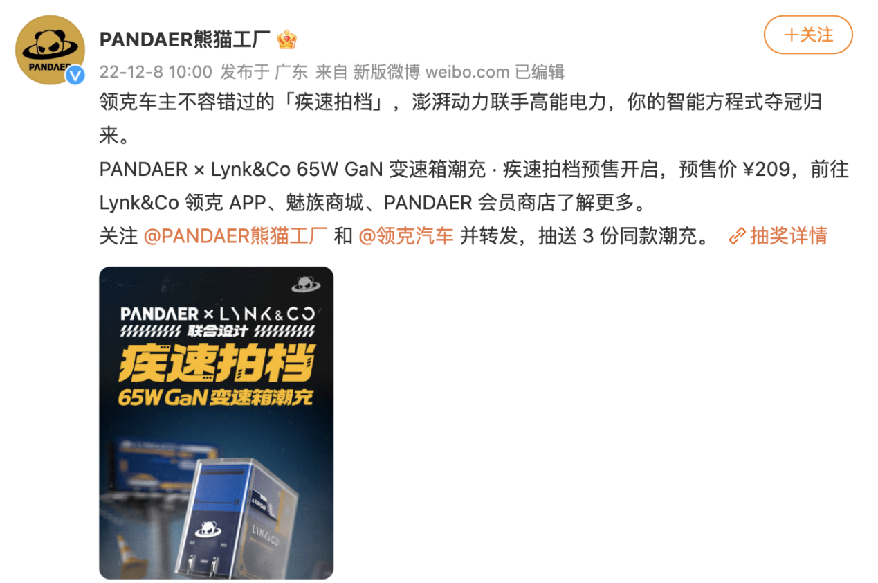 12 月 8 日,潮牌 PANDAER 熊猫工厂官宣:与领克汽车联合设计,并推出 PANDAER × Lynk&Co 65W GaN 变速箱潮充。这款充电器与标准版 65W GaN 潮充保持相同性能,并在外观加入大量领克元素。