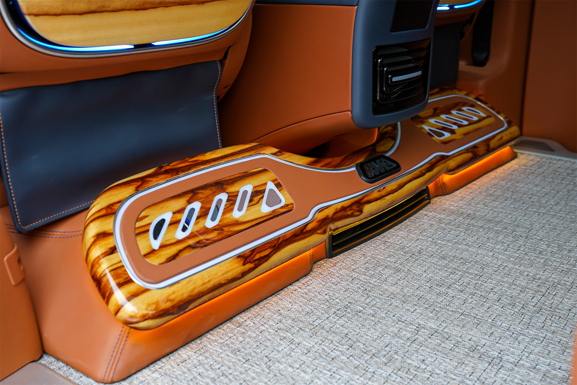内饰的定制很有亮点。采用橙色与深蓝色搭配,加上虎皮木纹包覆,精致的走线,匠心打造,质感满分。正副驾驶座椅真皮包覆,新增了大容量车载冰箱,整体驾乘体验都很不错。