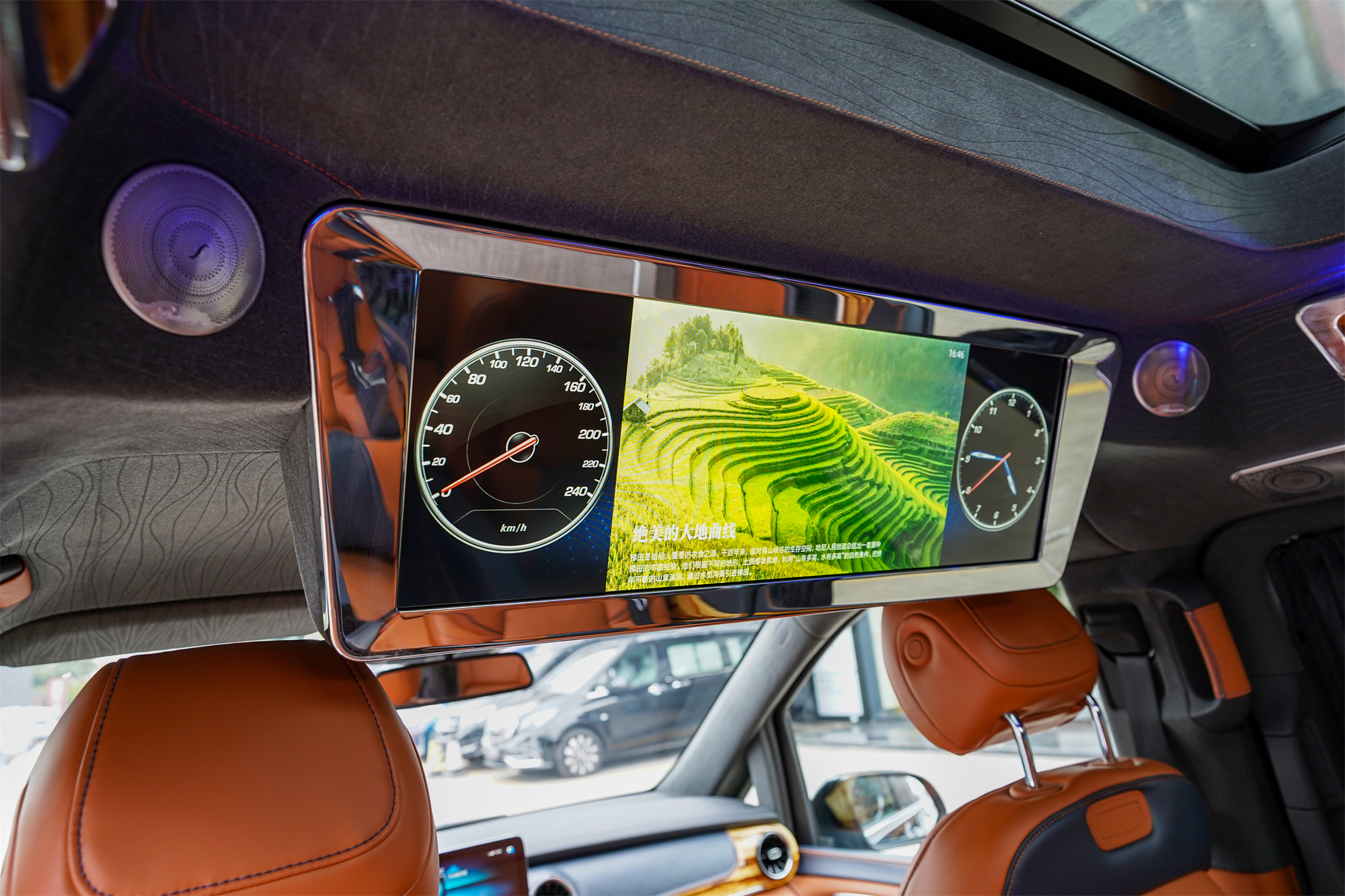 前排座椅后背搭载隐藏式折叠小桌板,方便后排乘客办公处理文件,或者是就餐。顶部是高顶液晶电视,吃饱喝足,还能看会电视放松一会。