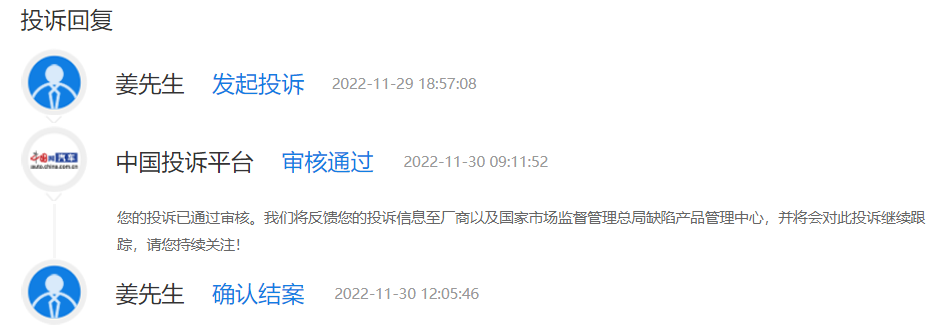 经过中国投诉-全国缺陷产品投诉平台与厂家及4s店沟通后,车主姜先生于11月30日得到厂家满意答复并选择结案。日前,记者对投诉车主姜先生进行电话回访,姜先生表示,目前问题已得到妥善回复,4s店已承诺将尽快处理解决姜先生长安UNI-K手机远程操作空调问题和车轮回正方向方向盘回不正的问题。车主还表示:后续也会对车辆进行持续观察,如果再出现问题,仍将第一时间到中国投诉-全国缺陷产品投诉平台进行反馈。最后长安UNI-K的车主姜先生表示,,自己非常感谢中国投诉-全国缺陷产品投诉平台,希望平台越来越好,可以帮助更多的消费者解决投诉问题。