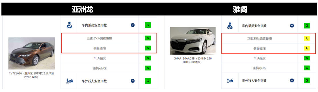 而本田雅阁在安全性上就没有亚洲龙那么出彩了,虽然它的“车内乘员安全指数”也同样是“G”,但在正面25%偏置碰撞和侧面碰撞两个细分项目上,却是“A”,比亚洲龙低了一档。而且同属广汽本田旗下的皓影、凌派,其表现也同样不如一汽丰田旗下同级产品。在安全配置上,雅阁的低配车型缺失了后排侧气囊、前/后排头部气帘和膝部气囊,最顶配车型也仅仅是增添了前/后排头部气帘,虽然主动安全配置也很高,但低配车型“减配”了,没能做到高低配一视同仁。