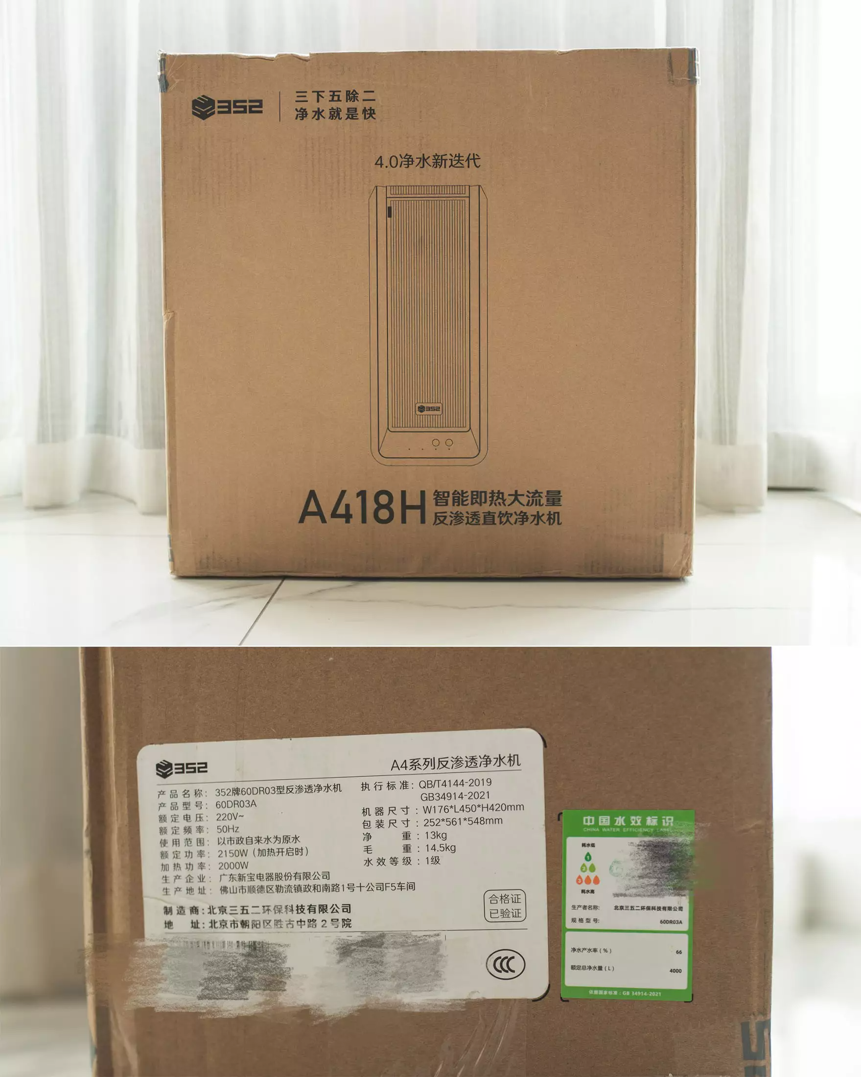 A418H包装没有特别豪华的感觉,但在配置和卫生方面顾及全面。A418H是A4系列首款型号,也是首次将紫外消毒植入水箱内部,加上即热功能,总功率较上一代有所提升达到2150W。